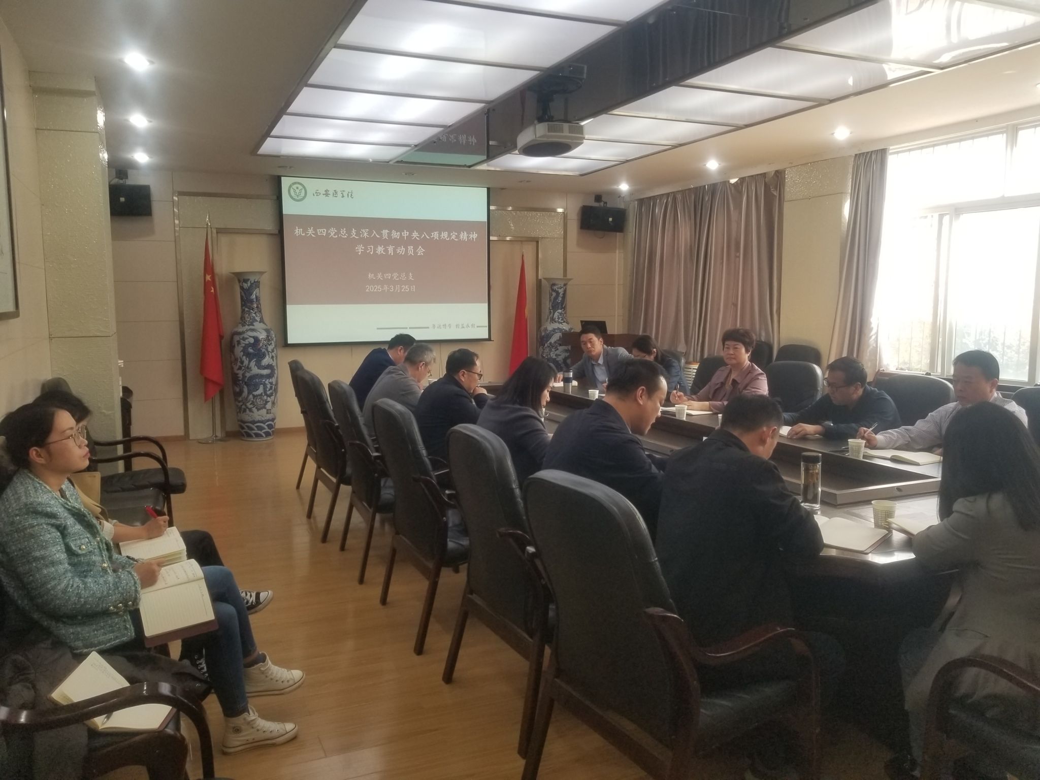 按照学校党委工作安排,3月25日下午,机关四党总支在高新校区二楼会议室召开深入贯彻中央八项规定精神学习教育动员部署会。会议由机关四党总支书记靳红樱主持,机关四党总支全体党员干部参加会议。